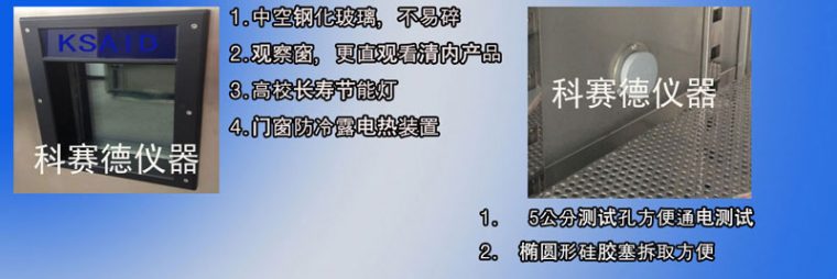 639cc全民彩恒温恒湿试验机在做低温测试(-40℃)时工作室的温度是远远低于周围的环境温度的,里面面冷,外面热,工作室的空气中的水蒸汽碰到玻璃直接凝华(气体直接变固体)形成冰霜,妨碍视线,也增加了安全隐患。所以为了解决这个问题,科赛德仪器的恒温恒湿试验机上面采用的都是防雾视窗玻璃,采用多层玻璃中空铝条组合而成,玻璃中间层填充了惰性气体,原理作用跟真空玻璃杯子类似,然后玻璃上面还安装了加热带,一般试验箱开始制冷后玻璃的加热带也开始通电开始加热,以达到自动除雾和隔热作用。