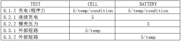 B)测试:一个完全放电的电芯能够承受1ItA的电流反充电90min. C)接受条件:不起火,不爆炸。 8详细要求和测试(锂系列)
