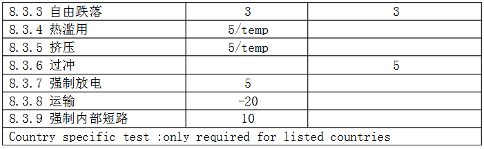 如果电芯被规定的最高或最低充电温度超过了表4中预估的最高或最低温度,那么这个电芯可以充电,如果适合试验,应在规定预估中最高上限加5℃和在最低的下限减5℃。电芯应该满足条款8.3.1、8.3.2、8.3.4、8.3.5和8.3.9。还应提供一个合理的阐述确保电芯的安全。
